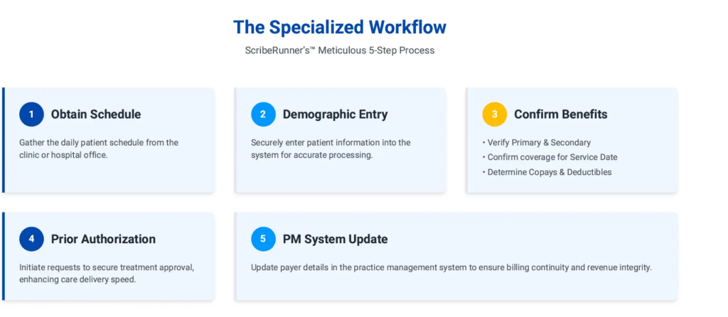 ScribeRunner provides comprehensive eligibility and benefits verification services for medical practices nationwide. Our specialized team ensures accurate verification before every appointment, reducing denials and improving cash flow.