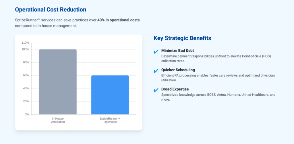 The time savings allows practices to operate efficiently without adding staff or extends capacity to see more patients without increasing administrative overhead. Professional services can save practices over 40% in operational costs compared to managing verification in-house.