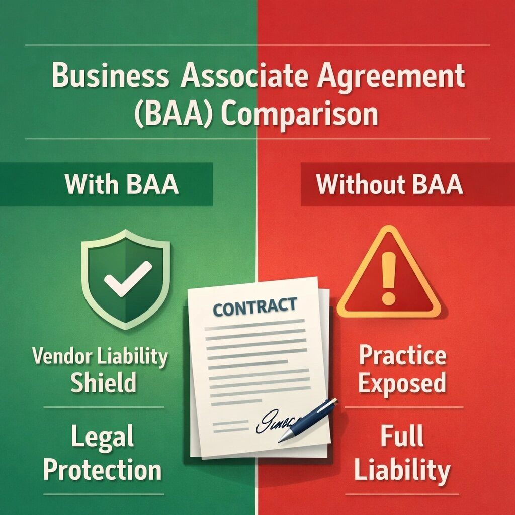 The BAA is not just a formality. It creates a legally enforceable contract that holds vendors accountable if patient data gets compromised. Without this agreement, you assume full legal responsibility for any breach that occurs on their servers.