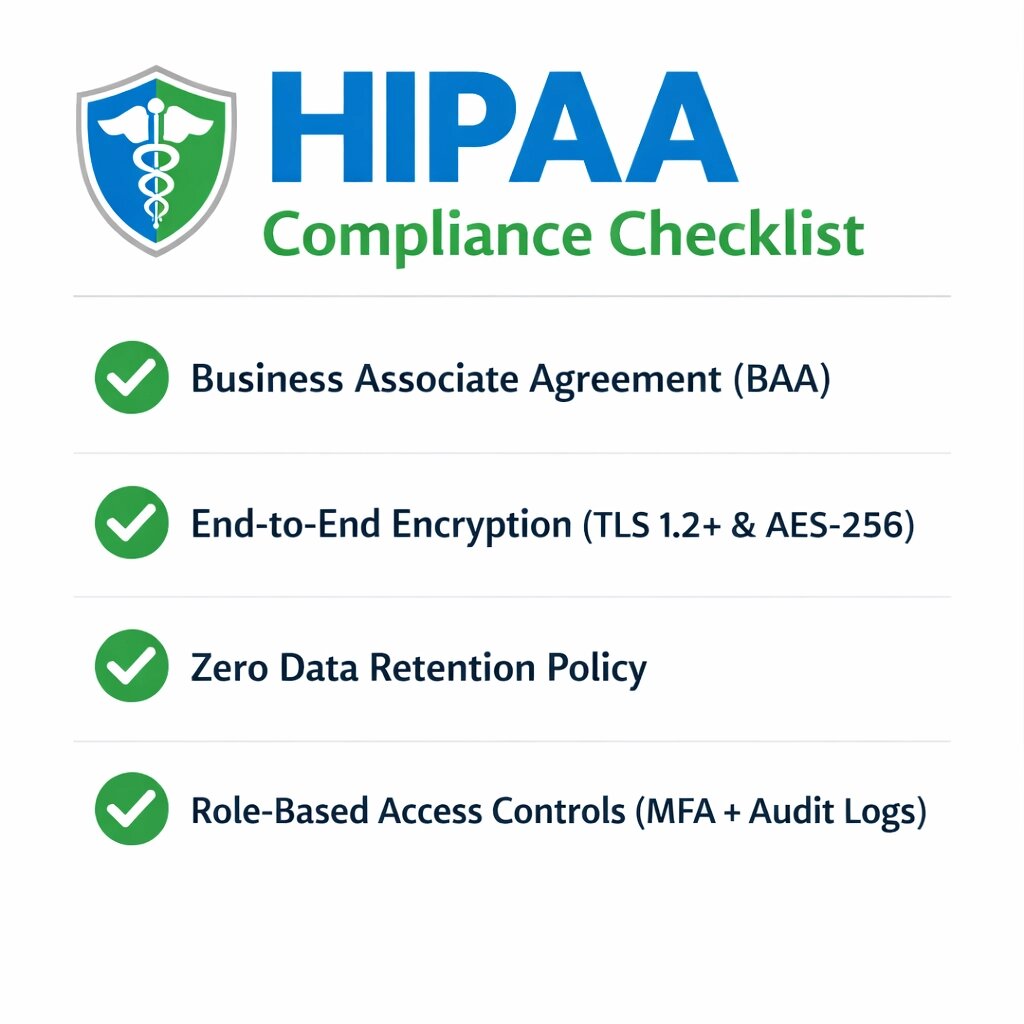 Security infrastructure includes full Business Associate Agreement execution, zero data retention policies, AES-256 encryption, and role-based access controls as standard features. No premium tier required for compliance.
